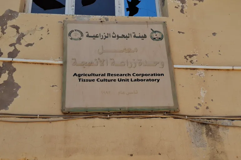 خلال جولة ميدانية، رصدت الجزيرة نت آثار الدمار بمقر بنك الموارد الوراثية التابع لهيئة البحوث الزراعية، الذي لم يتبق منهُ سوى مبانٍ طالها أثر الحرب، وعينات من البذور والنباتات تناثرت على أرفف وأرضية مقر بنك الجينات.