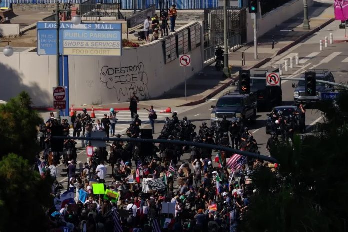 وقد بدأت التوترات في لوس أنجلوس بولاية كاليفورنيا بعد أن نفذ ضباط من وكالة إنفاذ قوانين الهجرة والجمارك حملة مداهمات على شركات يشتبه في قيامها بتوظيف مهاجرين غير نظاميين وتزوير سجلات التوظيف، وقاموا باعتقال العشرات بتهم تتعلق بانتهاك قوانين الهجرة، ما أدى إلى احتجاجات واسعة تحولت إلى اشتباكات بين المتظاهرين وقوات الأمن، استخدمت فيها الشرطة العنف لتفريق الحشود.
