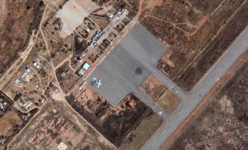 تُظهر صورة أقمار صناعية طائرتين بدون طيار وحظيرة جديدة بالقرب من ممر الطائرات في مطار نيالا السودان، بتاريخ 14 يناير 2025. (Maxar Technologies/Handout عبر رويترز
