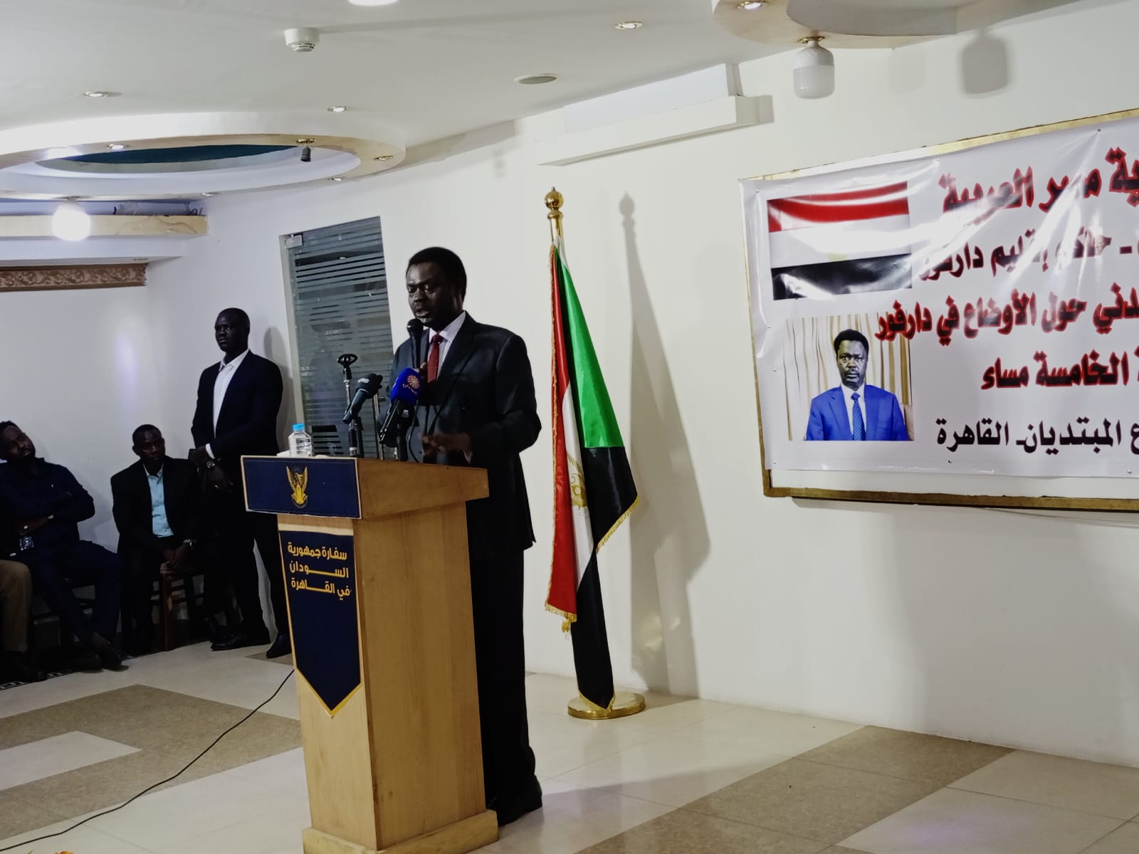 ودعا خلال حديثه مساء اليوم ببيت السودان بالقاهرة في اللقاء التنويري مع القيادات السياسية وقيادات المجتمع المدني حول الأوضاع في دارفور دعا إلى ضرورة دعم الارادة الشعبية والعمل على حل مشاكل البلاد . وجدد رفضه زعم المليشيا المتمردة بقيام حكومة موازية.