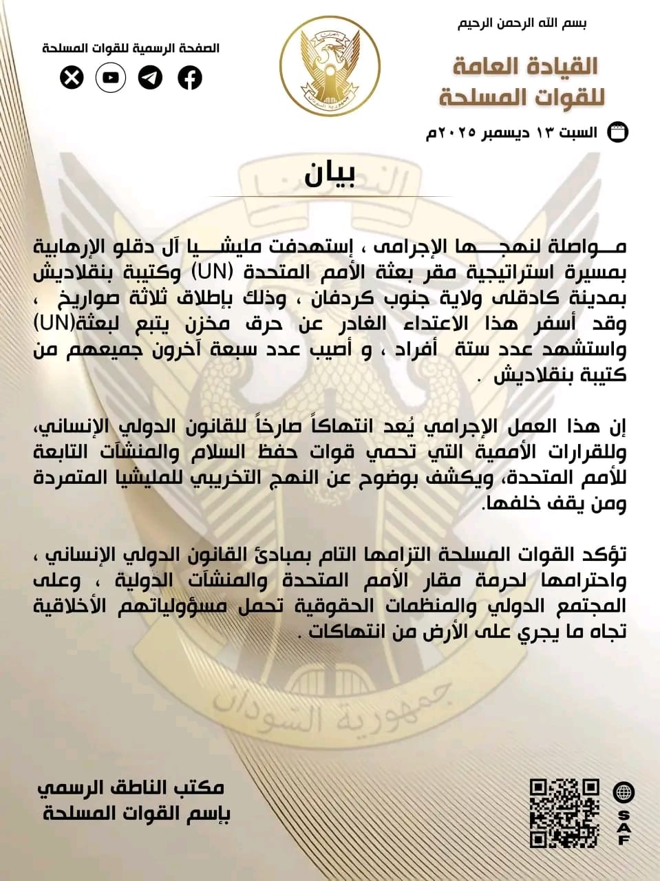 واكدت القوات المسلحة التزامها التام بمبادئ القانون الدولي الإنساني ، واحترامها لحرمة مقار الأمم المتحدة والمنشآت الدولية ، واضاف البيان “وعلى المجتمع الدولي والمنظمات الحقوقية تحمل مسؤولياتهم الأخلاقية تجاه ما يجري على الأرض من انتهاكات”.