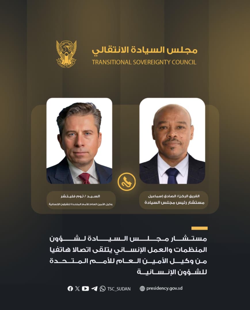 تلقى الفريق الركن الصادق إسماعيل مستشار مجلس السيادة لشؤون المنظمات والعمل الإنساني اتصالاً هاتفياً من السيد توم فلتشر وكيل الأمين العام للأمم المتحدة للعمليات الإنسانية، وذلك للوقوف والتعرف على الوضع الإنساني بالبلاد.