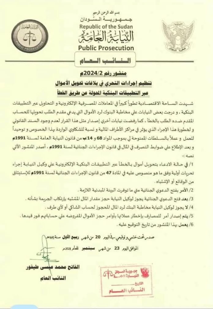 اصدر النائب العام مولانا الفاتح طيفور قرارا الغى بموجيه ما كان معمولا به سابقا من توجيه وكيل النيابة المختص المصارف برد الاموال المحولة خطا الى حساب الشاكى الذى اجرى عملية التحويل الخطأ وذلك بعد التحرى معه ووجه المنشور وكلاء النيابة ان يقتصر قرارهم على مخاطبة البنك بحجز المبلغ محل البلاغ واخطار العملاء بما تم وان يتم فتح دعوى لتفصل فيها المحاكم